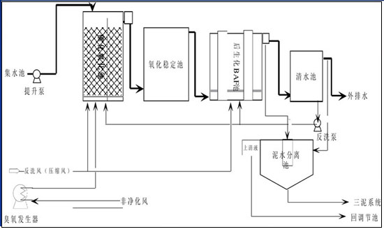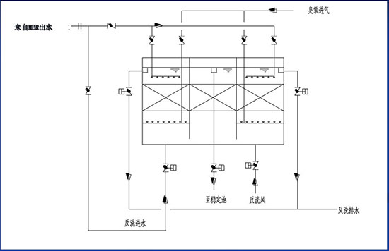 本工藝包在臭氧接觸反應(yīng)池中增加固體催化劑,以進(jìn)一步提高臭氧催化氧化的效果。
